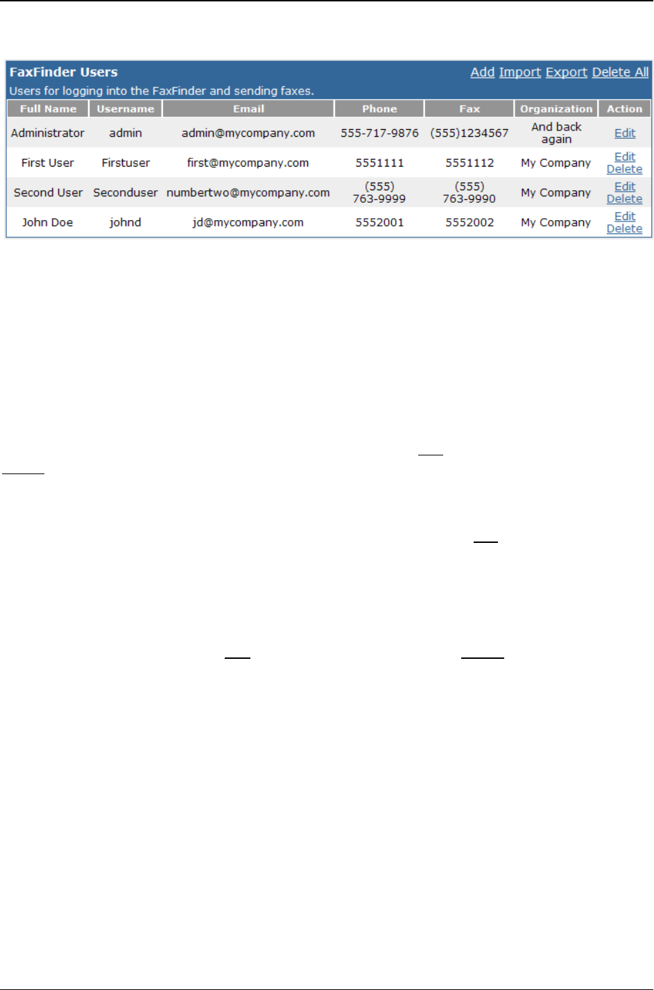 be edited or deleted as needed. Users are the definitions of people that have access to the FaxFinder for