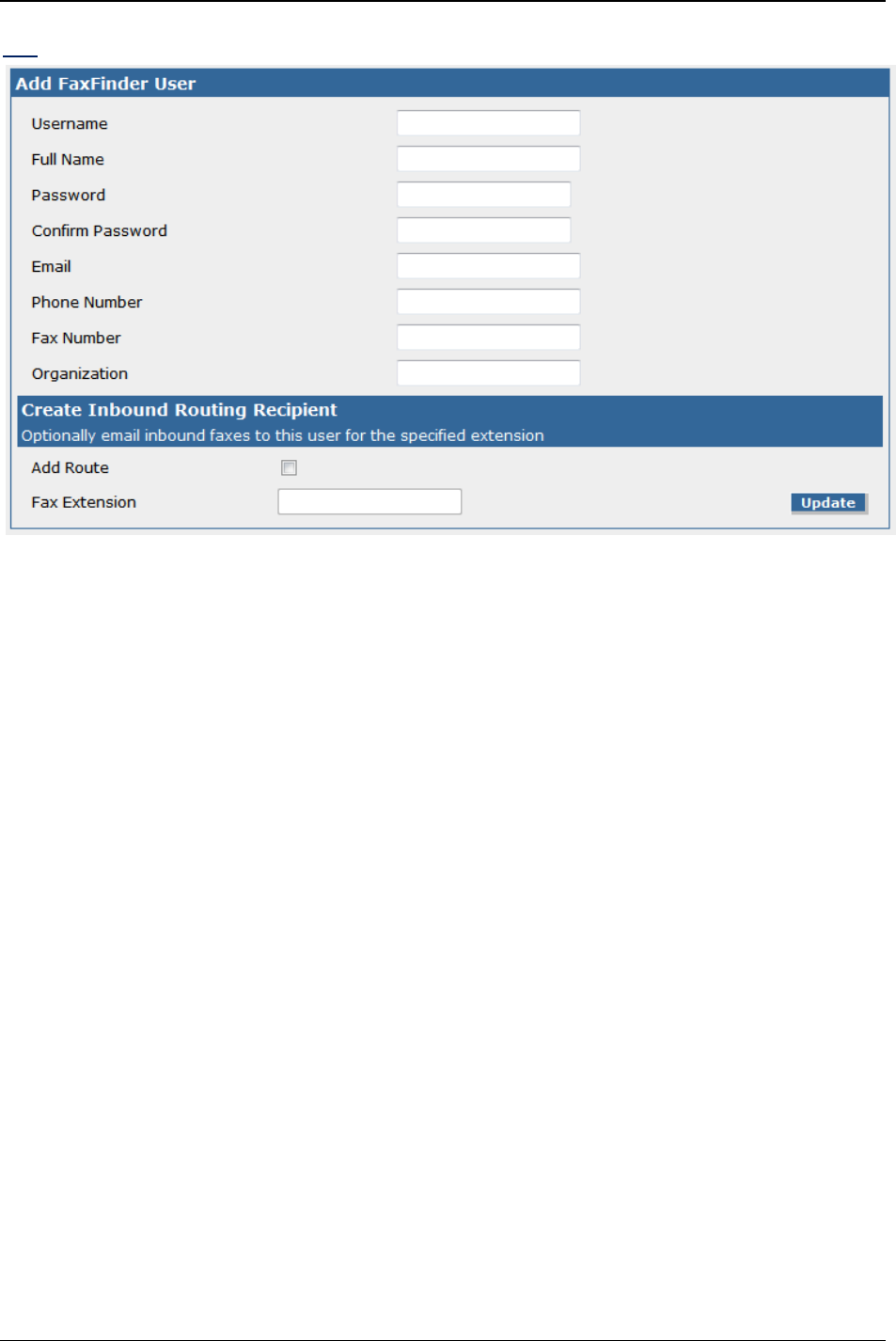 Clicking the Add link will bring up the Add FaxFinder User screen. Here you will enter the information to